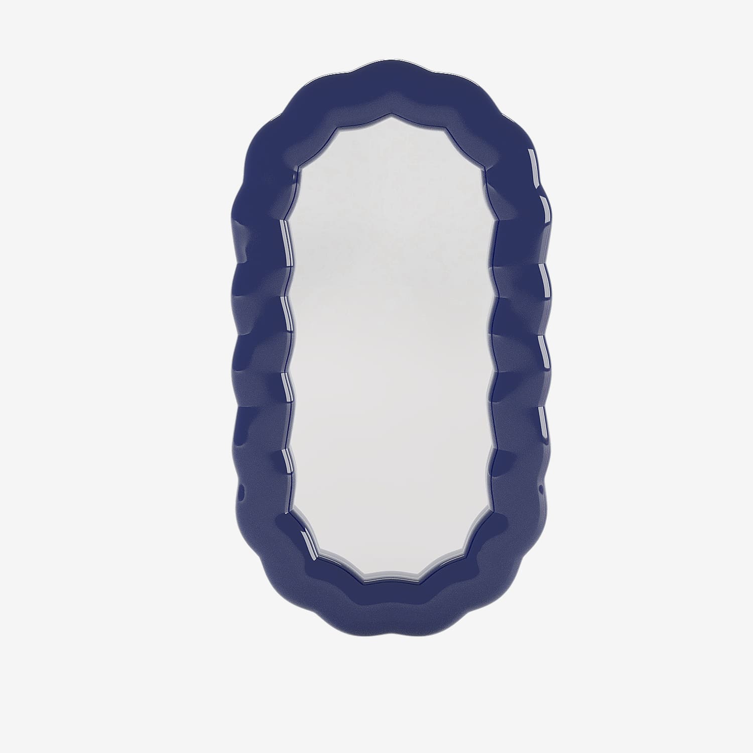 La couleur bleu marine dans un appartement est toujours une signature sobre et élégante . Sur ce miroir vague de forme ovale, elle s'encanaille légèrement au rythme des ondulations , avec un rebord que l'on trouverait presque moelleux. Dès lors, Brooklyn s'adapte à son entourage.