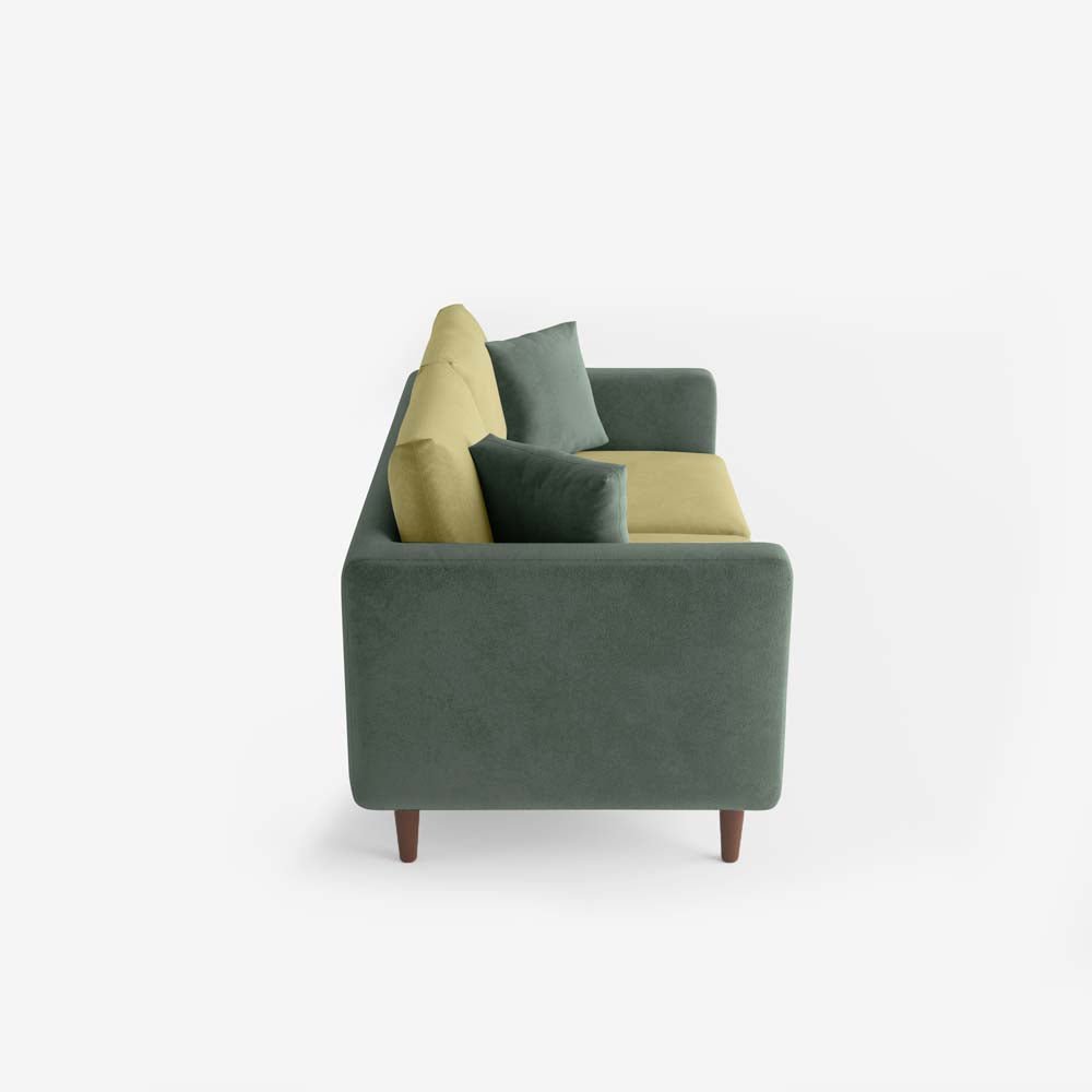Votre canapé Carthage bicolore vert apporte une touche d'élégance au design de votre salon. Mariez-le à des objets de décoration dorés, tels les rayons du soleil dans un décor champêtre, comme notre corbeille Éléonore par exemple. Complétez l'ensemble avec des meubles de bois clair comme le piètement en bois d'eucalyptus du canapé.