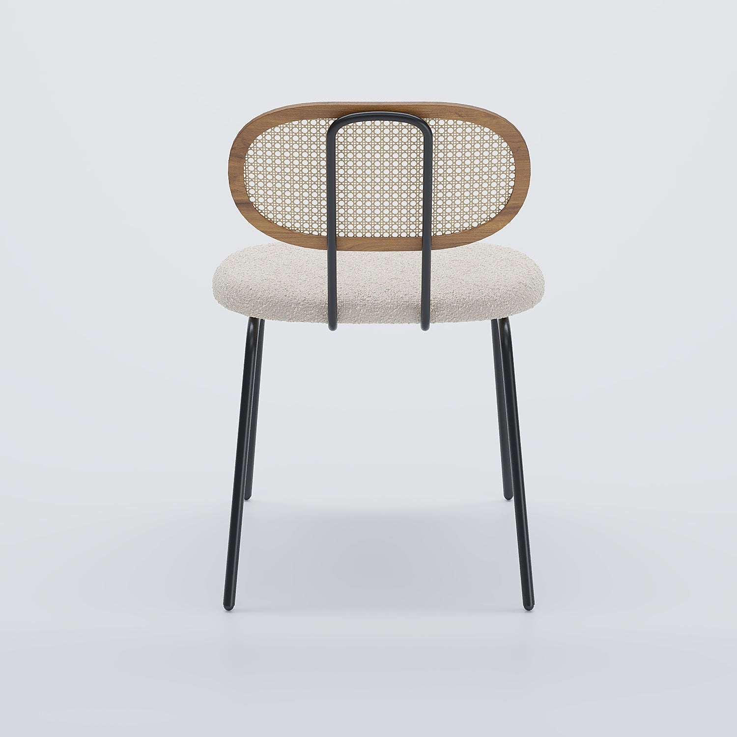 Cette chaise de salle à manger, avec son dossier en cannage et son coussin en laine bouclée, réussit l'alliance parfaite des matériaux chaleureux et des teintes attachantes . Une pincée d'élégance rétro 1900 avec le rotin, un zeste d'ambiance cocooning avec le tissu bouclette, ajoute l'inclinaison caractéristique du dossier et des pieds en métal : vous obtenez une chaise vintage confortable qui confère un charme fou au coin repas .