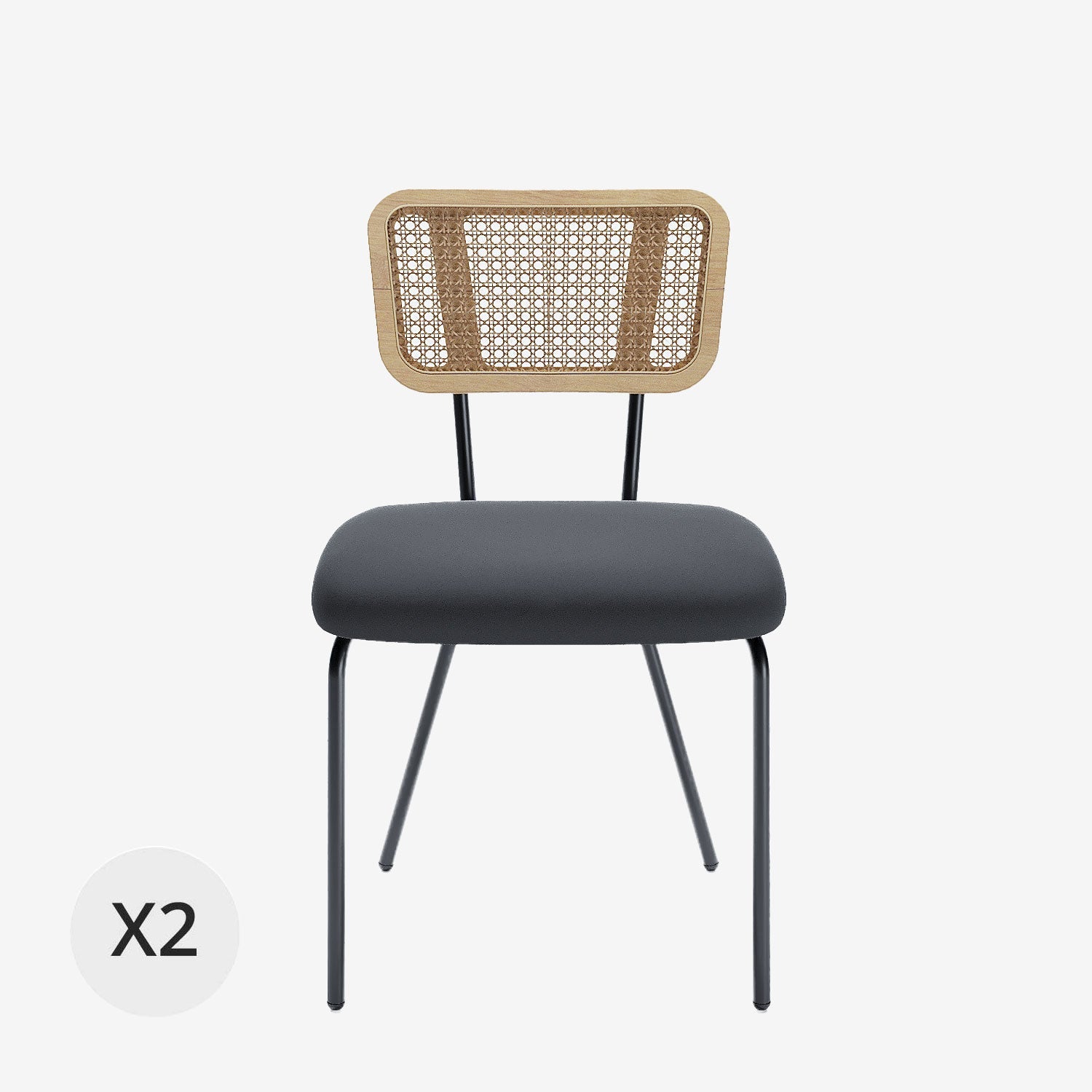 Lot de 2 chaises de salle à manger dossier rotin, coussin velours noir, piètement métal noir Sofia