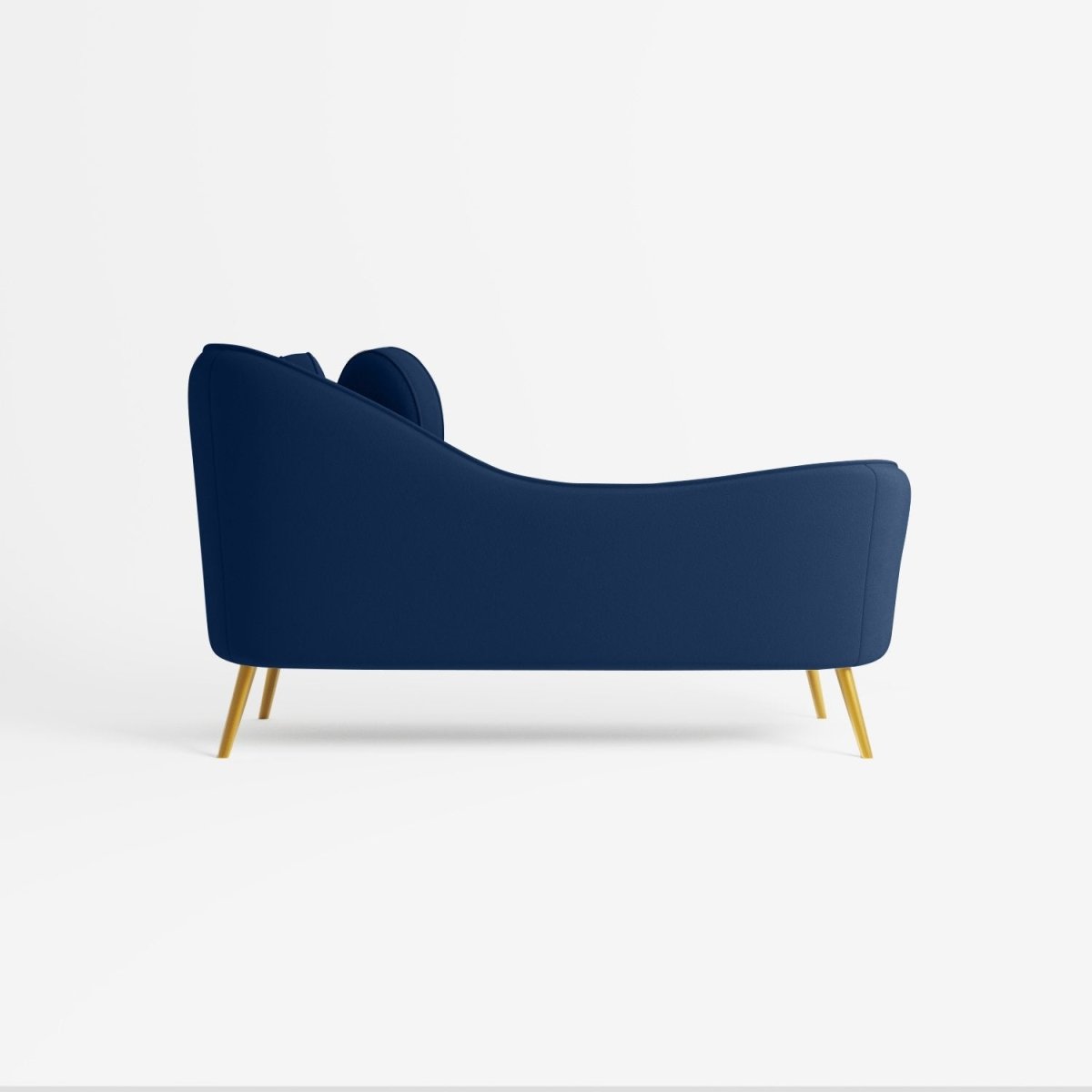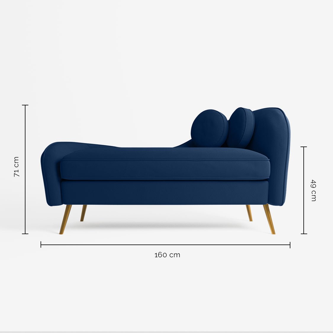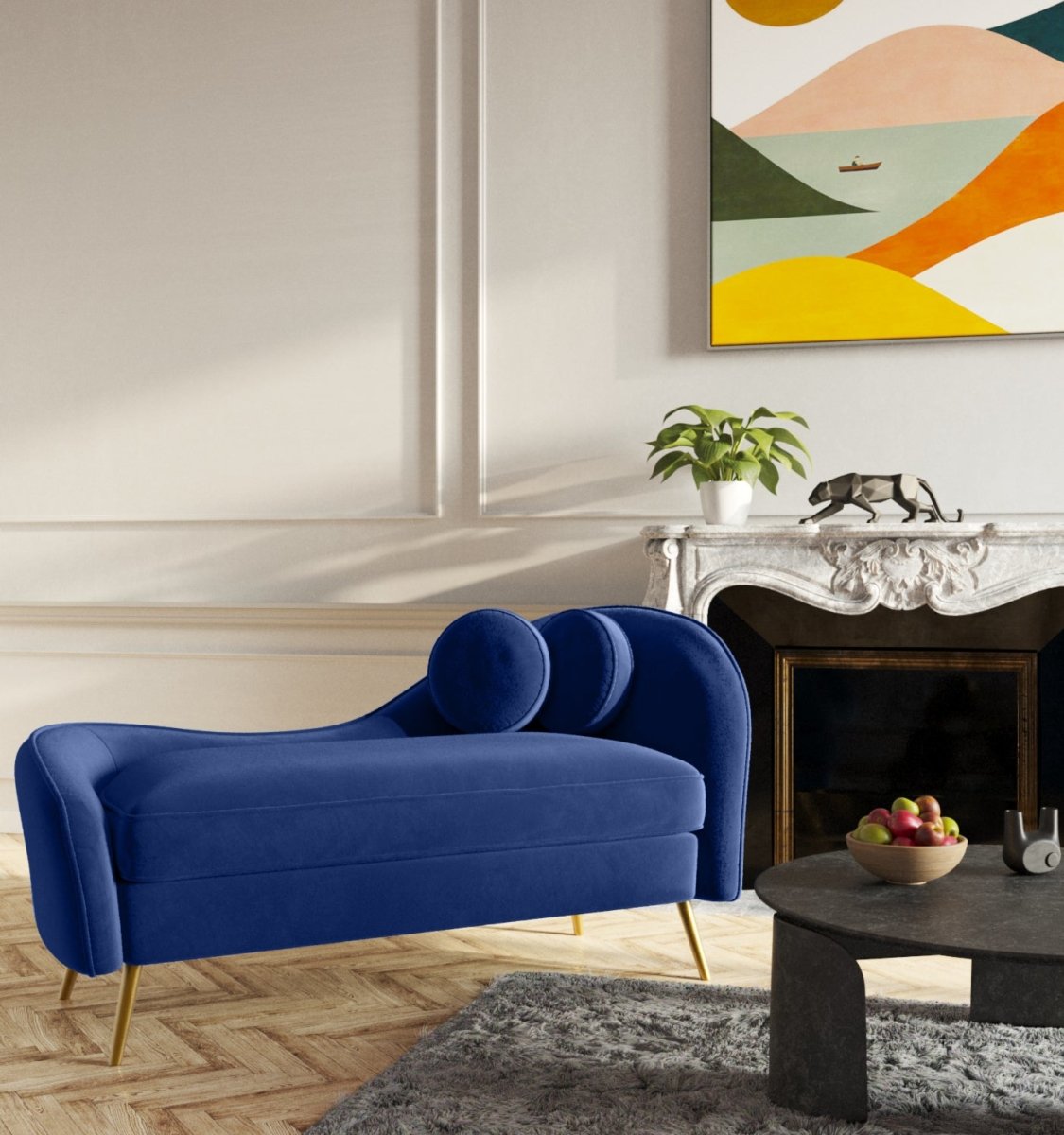 Méridienne design Mila en velours bleu nuit et pieds dorés