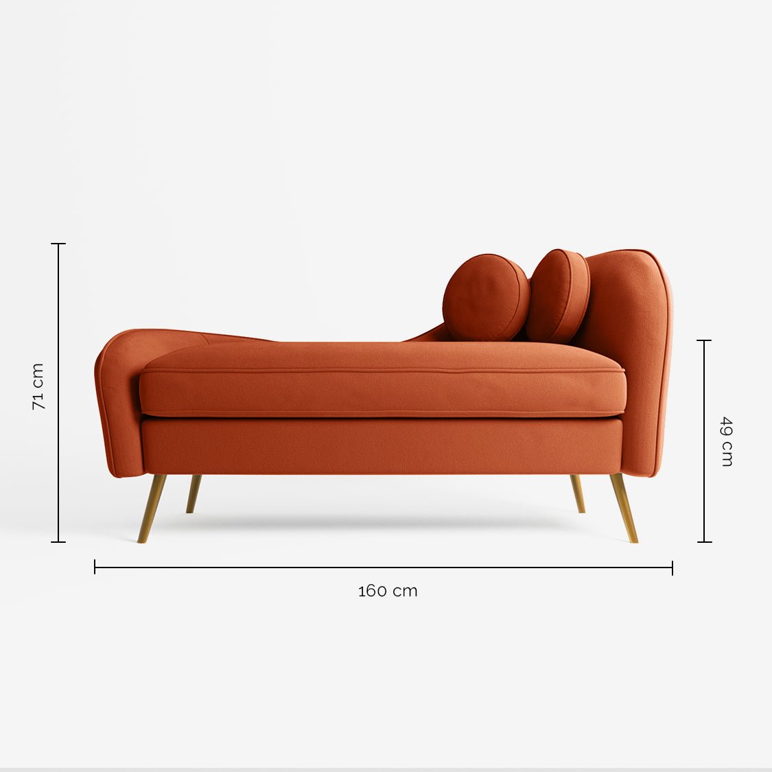 Élégante par essence avec son velours, ses courbes féminines et ses pieds dorés, la méridienne design Mila est emblématique de la fusion esthétique-confort. Son assise est chaleureuse avec sa couleur ocre et accueillante pour partager à trois le café gourmand servi sur la table basse. Vous aspirez à vous allonger ? Sa longueur souple et moelleuse vous attend.
